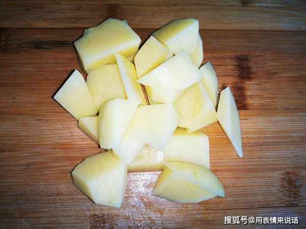 5、我们准备一个“呆萌”的土豆,去皮洗净,切成滚刀块,用水泡一下,这样可以洗去土豆表面多余的淀粉,防止一会煮的过程中,土豆变得黏糊糊的,口感不太好。