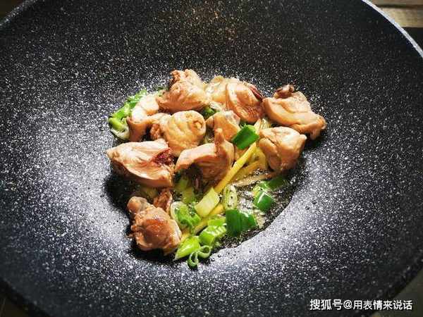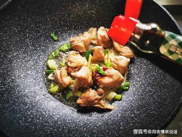 8、放入葱花和生姜丝炒出香味,加入调味品,一勺生抽,半勺老抽,翻炒到鸡肉变色。