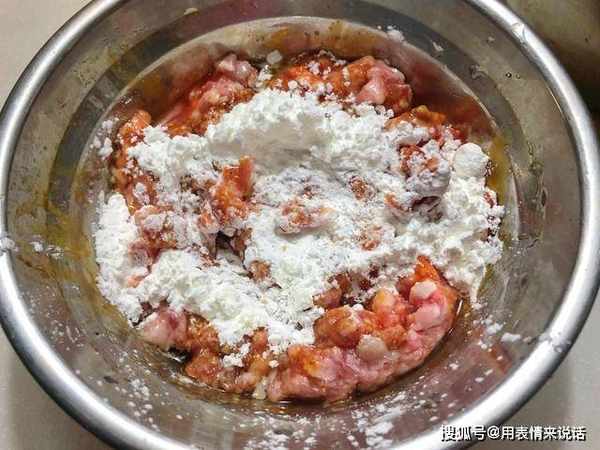 2、搅拌的同时,别忘了添加淀粉,淀粉能凝结肉丸,让肉丸抱团,变得紧密结实,不宜散开,搅拌肉馅的这一步,决定了丸子的塑形,记住,朝着一个方向,耐心的搅动,让肉丸上劲,变得更筋道。