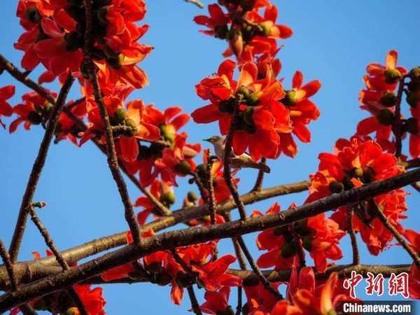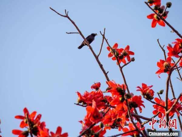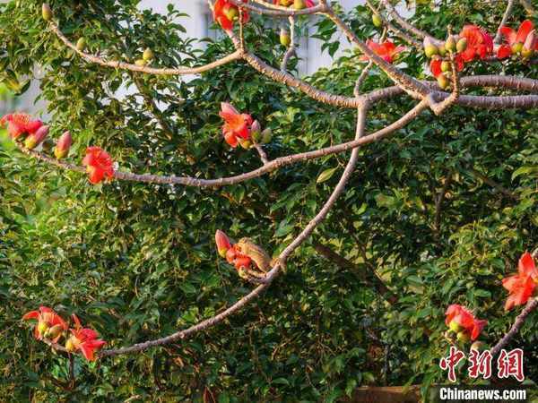 3月10日,海口市五指山路两侧的木棉花竞相绽放,吸引鸟儿和松鼠前来享受“花蜜大餐”,为椰城春日增添“生机”。