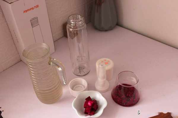 我們做氣泡水,首先我們要有一個氣泡水杯,以及二氧化碳,九陽的這一款氣泡水杯就很不錯。準備好氣泡水杯,冷開水,紅心火龍果,以及冰塊和薄荷葉少許。