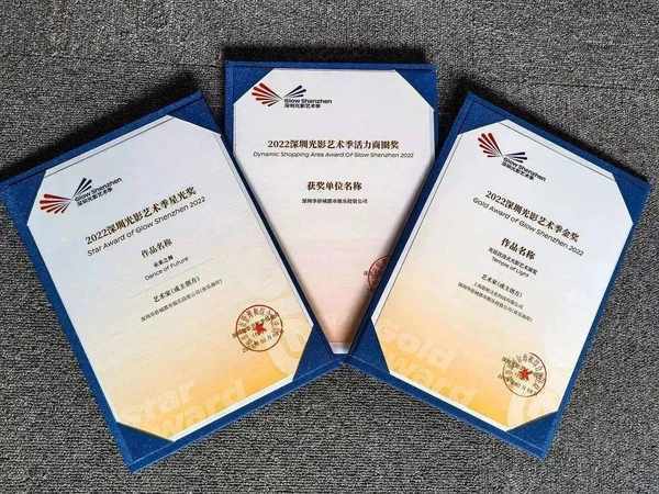 在本届深圳光影艺术季中,深圳欢乐海岸共摘得2022深圳光影艺术季活力商圈奖、金奖、星光奖三项大奖,其中“光廷Temple of Light沉浸式光影艺术展”获得金奖,《未来之舞》获得星光奖,这已经是深圳欢乐海岸连续第三年获奖。