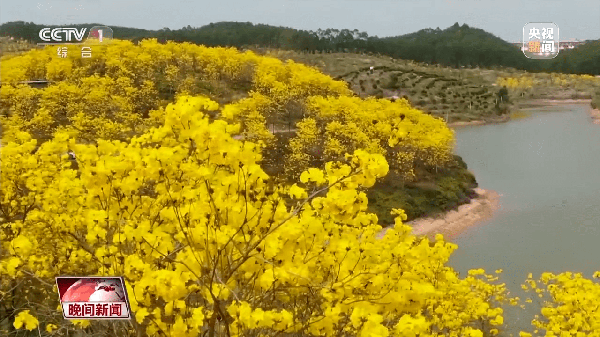 同样,在广东省肇庆市800多亩黄花风铃木,迎风绽放,犹如一片黄金花海。一朵朵风铃状的花朵簇拥成球,与绿水青山相映成趣,吸引了不少游客前来打卡拍照。