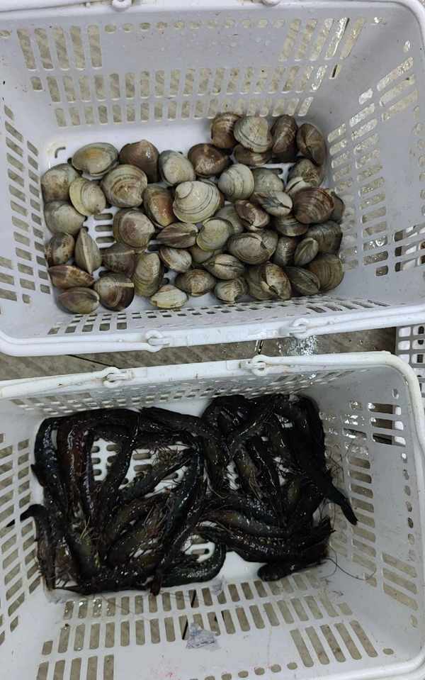 挑了一些虾,一只蟹,还有不多的带壳文蛤。去秤上称了,小哥一一记录下来,有重量,有单价,倒也蛮清楚的。诡异的是重量都是公斤,而价格则是市斤(500克)。我提议马上付款,店家说不急,吃好后再付款。觉得有道理,大家就坐等海鲜上桌。