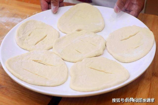 在面剂子上撒上干面粉、防止粘连,把面剂子逐个摁扁,擀成半厘米厚的圆形面饼。然后在面饼上切开两条缝,这样炸制的时候油饼能快速膨胀鼓起,口感更加蓬松。