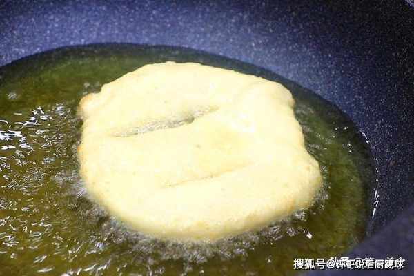 全部做好以后,我们开始炸制,起锅烧油、油温升至160度时,把面饼放入锅中,面饼遇热会逐渐鼓起,保持小火炸1分钟左右。