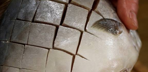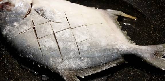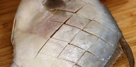 洗干净以后,用刀在鱼身上打上十字花刀(鱼两面都要打上花刀。)。