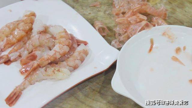 用水化开冰后,铰去虾脚,剥去虾壳,挑去虾线,只留下虾尾。