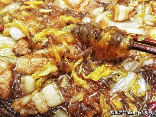 把五花肉煎成微黄色,渗出油脂,放入白菜炒一炒,加水炖煮,放生抽、冰糖、辣椒、花椒、八角来提味,不爱吃辣的可以不放辣椒,炖煮十来分钟,先放入白菜,再放入粉条,接下来粉条会吸收油汤汁的精华,变得饱满起来,用这道菜下饭,再合适不过了。