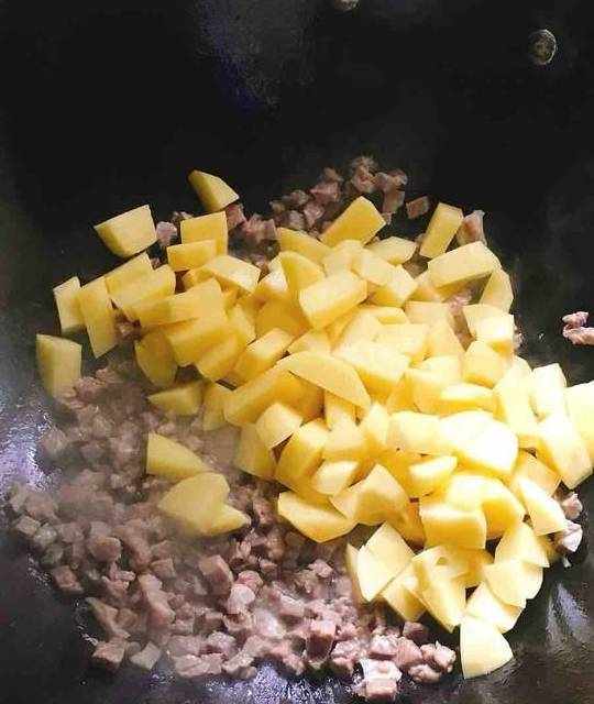 4.加入土豆块翻炒,然后烹入料酒,加入生抽炒匀,土豆变色后关火