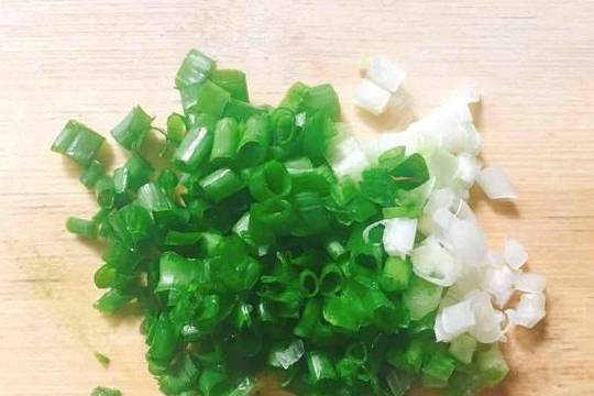 7.小葱切末,焖好的米饭中加入葱末,用勺子趁热拌匀即可