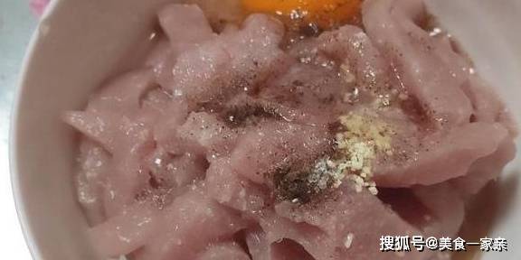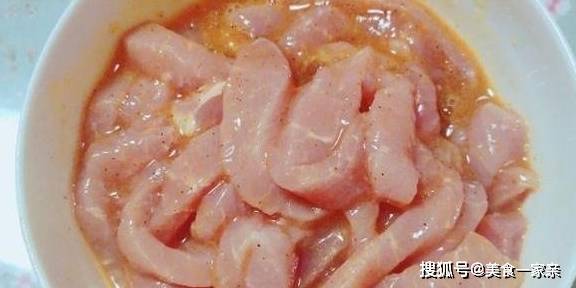 步骤一、先把里脊肉洗干净后切成0.5厘米厚的大肉片,用刀背轻轻的排剁一下,在切成小手指粗细的条状放入碗中,然后加入半茶匙的盐、料酒好胡椒粉用手捏均匀后腌制15分钟待用