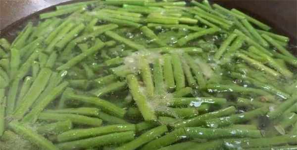 5、锅中烧开一锅开水,加入一勺香油,然后倒入豆角焯一下水,加入香油可以让豆角保持绿色,加一勺盐,在水中焯一下5分钟后取出。
