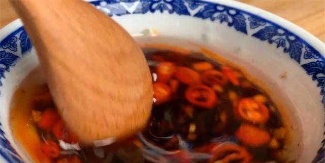 3、然后准备一些材料,准备两根小米椒,切成小块,放入碗中,准备两瓣大蒜,切成蒜末,放入碗中,烧热油然后倒在上面,在碗里加入3勺生抽、2勺香醋和1勺秘制辣椒油,用勺子搅拌均匀备用。