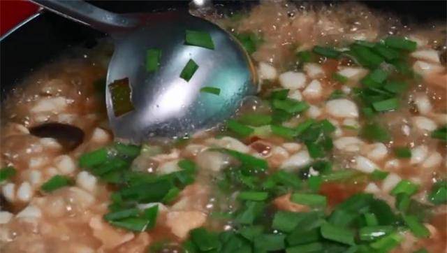 9、锅中加水。水开后,将准备好的芝麻粉撒入锅中,大火烧开。烧开后加水,再烧开,放入青菜和配菜,用大勺拌匀,加入生抽、陈醋、盐、味精和香油,拌匀,加入韭菜,再煮两分钟即成从锅里出来。