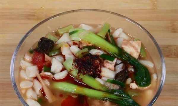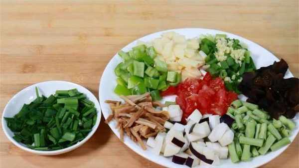 普通面粉、水、土豆、香菇、西红柿、蔬菜、青椒、豆类、洋葱、韭菜、大葱、盐、五香粉、生抽、陈醋、香油、辣椒油