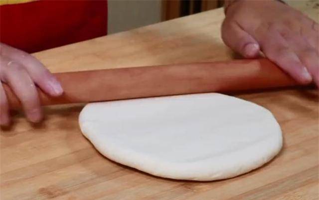 2、面团不用揉,用手按一下,让面团足够光滑,然后用擀面杖擀成1厘米厚的面饼。