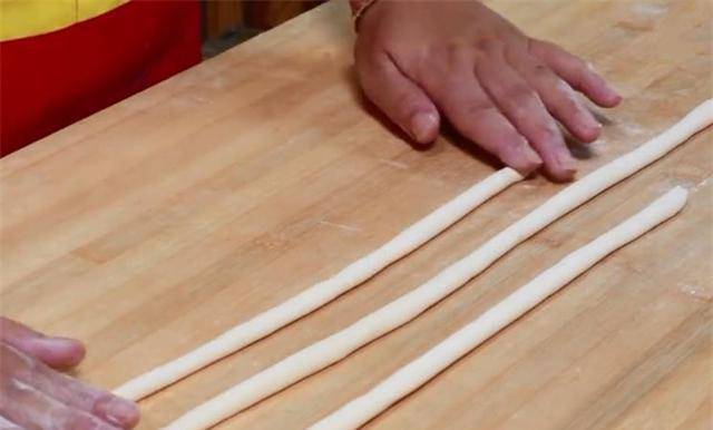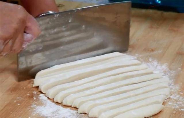 3、面团撒少许干面粉,用刀切成条状。
