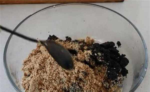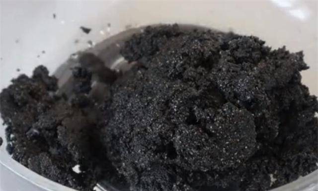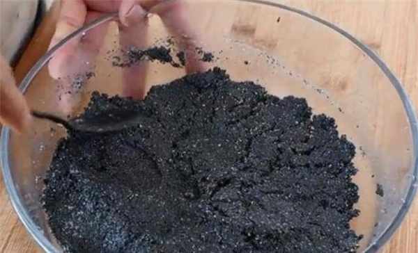 4、然后将烤好的芝麻倒入研磨机中。芝麻磨得越细越好。将磨碎的芝麻倒入盆中。