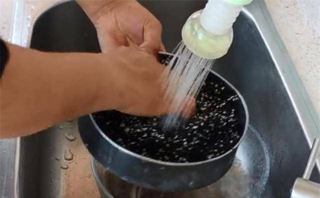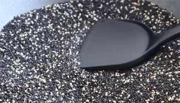 2、锅里不用倒油,把洗干净的芝麻倒入锅里,开中火,先把芝麻上的水分炒出来,再用小火把芝麻炒出香味芝麻被释放。种子出炉,然后关火,把芝麻放入碗中备用。