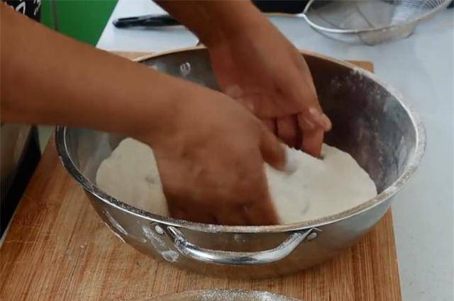 10、将撒好的芝麻球倒回糯米粉碗中,让馅料沾上糯米粉。只需将冷水流过并重新旋转糯米粉即可。这个元宵节慢慢地越来越大了。