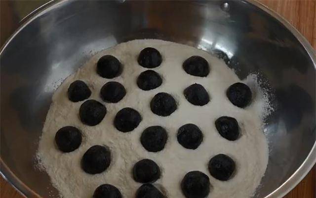 8、将所有的芝麻球组装好,然后在池子里再倒一点糯米粉,然后把芝麻球一个一个的放进糯米粉碗里,摇动池子,让这些芝麻球均匀分布。糯米粉。
