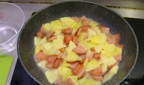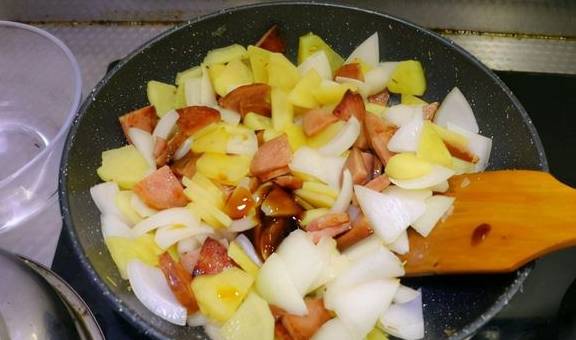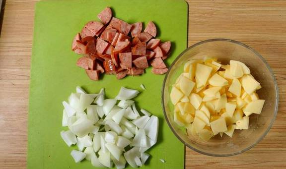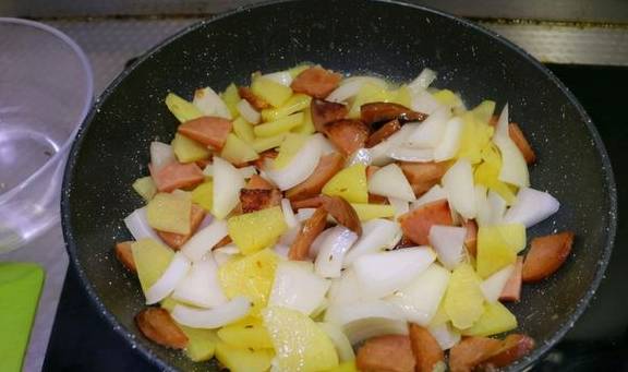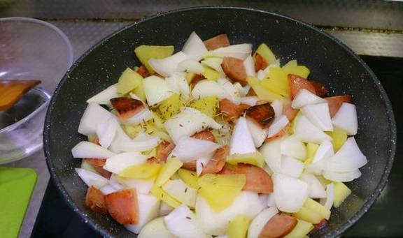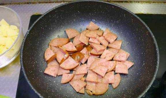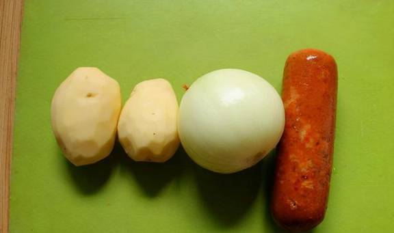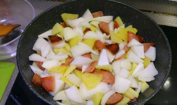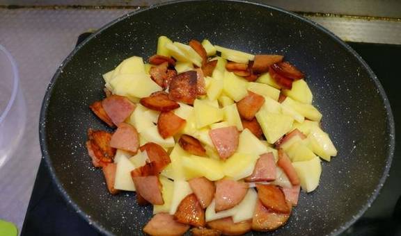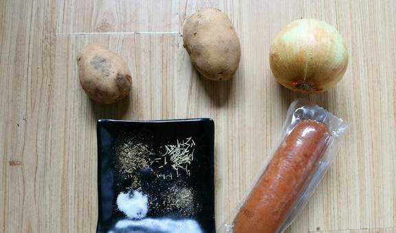 配料:土豆,挂炉烤肠,黑胡椒碎,迷迭香,蚝油,白洋葱,食盐,白胡椒粉,温开水等