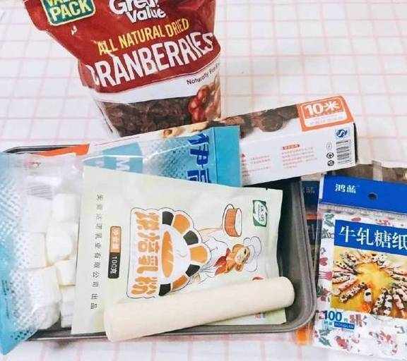 黄油,棉花糖,奶粉,花生碎,果干适量(根据自己的喜好,小编这里选取的是蔓越莓)