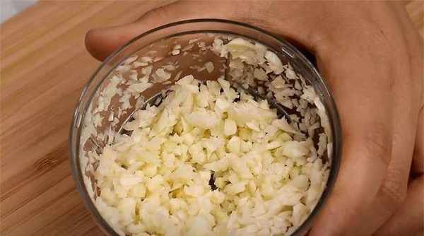 3.将几瓣大蒜放入大蒜提取器中,拖入切碎的大蒜中。