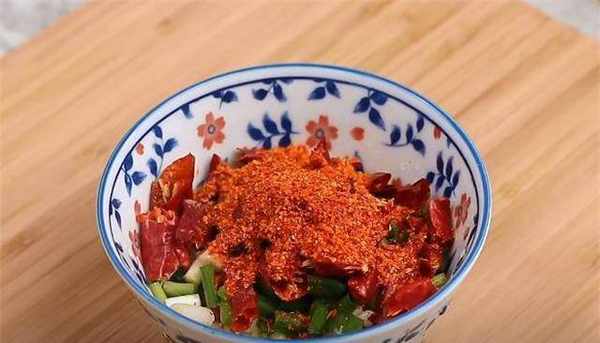 4.沥干后放入碗中,加入少许葱花和干辣椒,再加入一勺辣椒粉。
