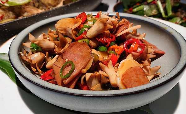 五香芭蕉花,酥脆咸麻,鲜香雅致,地道的哈尼风味。芭蕉花是芭蕉树之花,具有独特的鲜甜味。哈尼族人民不但食花,且连花苞一块食用,民间用其炒鸡杂或炖鸡供产妇吃,是滋补催奶的佳品。