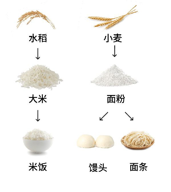 我们日常吃的主食,以大米和小麦和小麦为主。小麦磨成面粉,又可以做成馒头、面条、面包、饼等等。