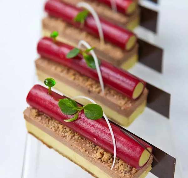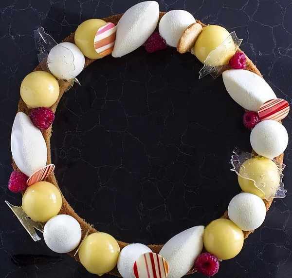 2、混合榛果可可馅料与红加仑,用75%的榛子奶油填充挞皮。