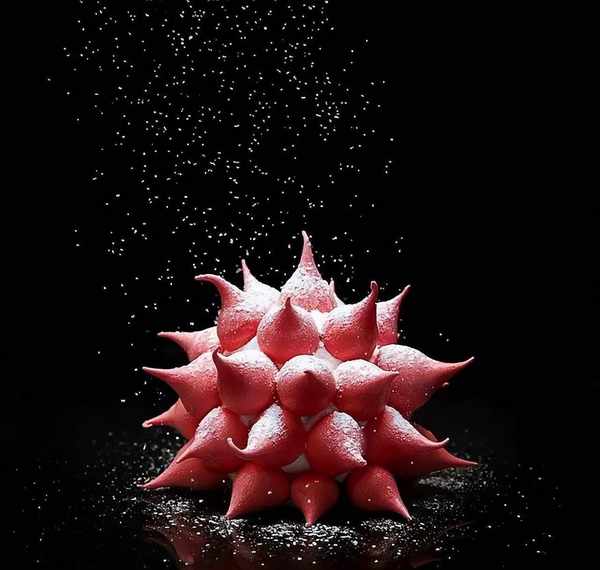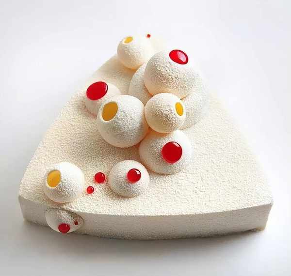 4、用直径7mm的裱花圆嘴在塔上挤出水滴状。-26℃冷冻3小时。