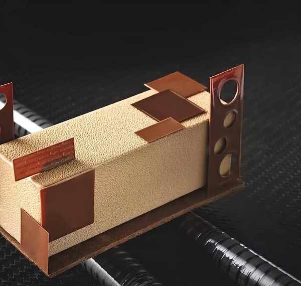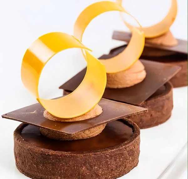 1、将卡玛榛果可可馅料装入裱花袋,盖在塔特( 75克/个)上约 3mm厚。