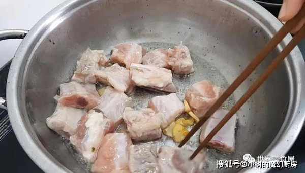 3、倒入排骨翻炒1分钟,稍微炒扁。