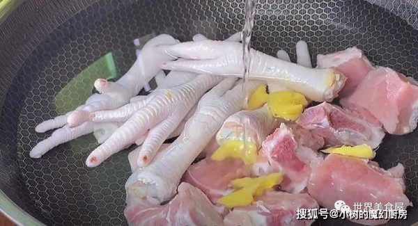 2、将鸡爪和排骨冷水下锅。放姜片、食盐、料酒去腥。大火煮沸。焯水三分钟后捞起。
