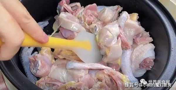 3、准备砂锅。放入油水。姜片爆香去腥,倒入切块的母鸡。稍微翻炒1分钟。