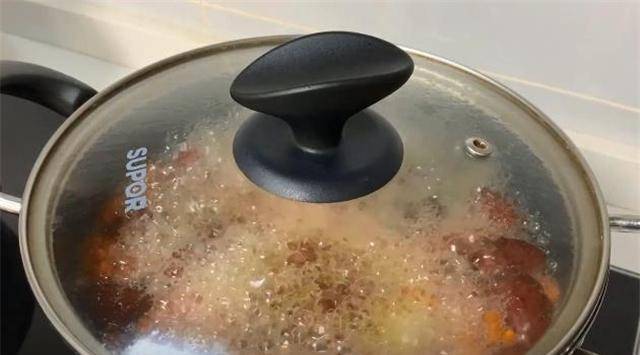 5.然后准备一个汤锅,倒入姜片和红糖,加入枸杞和红枣,然后加入梨最后倒入藕,然后加水只要没过藕就可以了,盖上盖子然后转大火开,沸腾后转小火炖15分钟,中间用勺子搅拌。