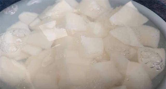 2.接下来,将梨去皮。去皮后先切块,中间不要有核,再切成条状,最后切成小方块。将它们放入碗中,加水浸泡一会儿。