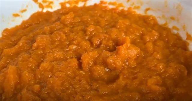 4.南瓜蒸熟后,用筷子轻松戳破即可。拿出来稍微凉一下,然后放到大碗里,用醋搓揉,这样搓出来的质量好,没有籽。