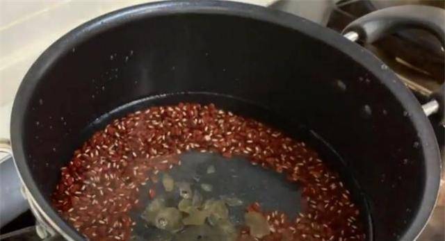 3.红豆溶化后,将红豆和水放入锅中,适量加水,加入冰糖20g,盖上锅盖,大火烧开,转小火煮30分钟。