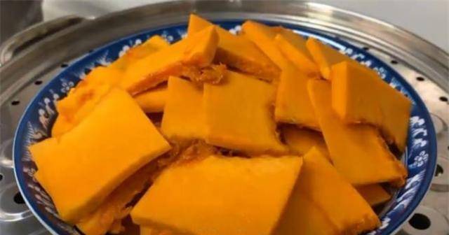 2、准备半个南瓜,用勺子取南瓜去皮,切成小块,然后切成薄片,装盘,上蒸锅,盖上盖子。从高温中取出15分钟。