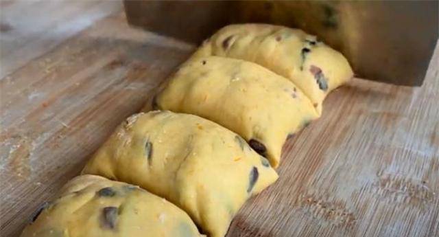 7、面团发好后,放在案板上揉面催烟,然后用手揉面团,然后倒入红豆,然后把面团对折,把红豆往里面折,揉好。面团再次将红豆与面团完全揉合。揉5分钟后,揉长。把它卷成一个长片后,把它分成大小相等的肉饼。