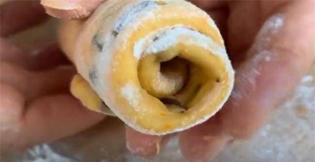 9.案板上撒上干面粉,用手将面团切开,折成一条牛舌状的线,从下往上卷起来,我们一个人的身体就做好了这个绿色的。