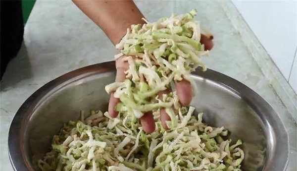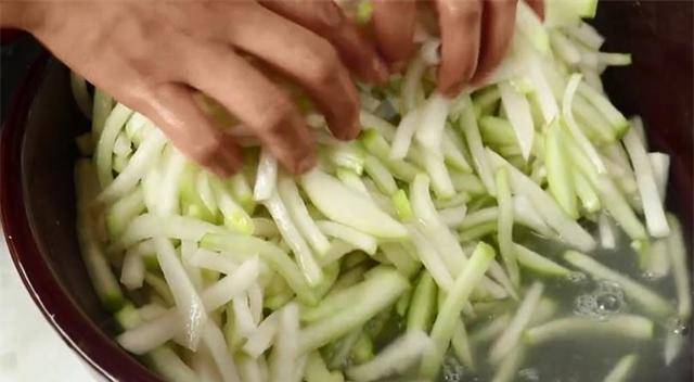 2、萝卜全部切好后,在里面撒些盐,用手抓均匀,腌一到两个小时左右,把萝卜里面的水分杀掉。腌制两个小时后,里面放了那么多水,才把萝卜里的水分挤出来。