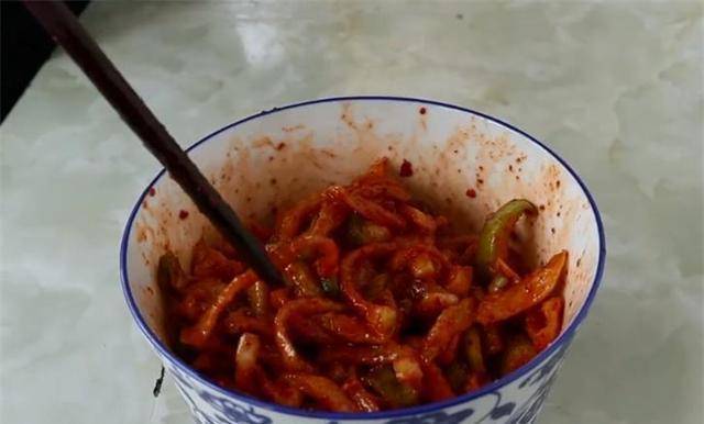 6、萝卜干后根据自己的口味加入红辣椒面,加入适量的盐和糖,最后加入花椒粉搅拌均匀。