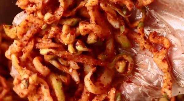 7、这时候萝卜块就可以吃了。我会拿一小部分给你看。将萝卜条喷上热油,加入生抽和陈醋,搅拌均匀即可食用。