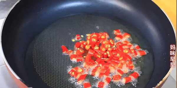 4、锅里倒入油,油热了以后把小米椒炸一下,这一步不能省略,小米椒不炸的话太辣,而且辣椒的香味激发不出来。