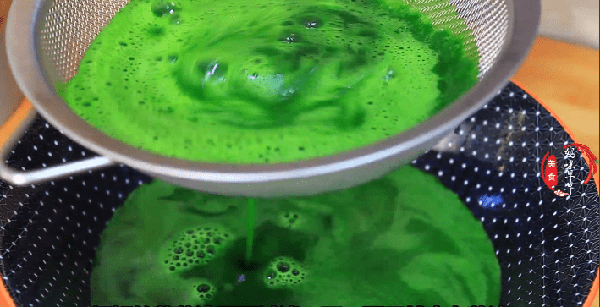 2,接着将菠菜放入料理机里,加入适量清水,打成菠菜汁,打好的菠菜汁需要过滤一下,要不然会有菜渣。